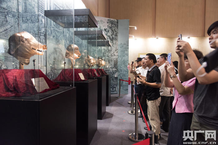 游客在觀看參展的4個國寶獸首(央廣網(wǎng)記者 官文清 攝)