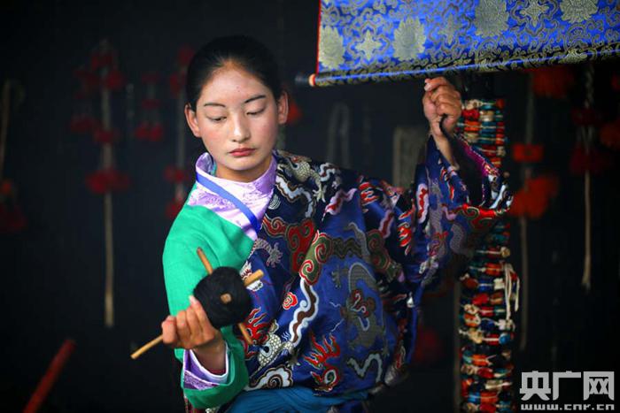 玉樹藏族姑娘現(xiàn)場紡織牦牛線(央廣網(wǎng)記者 張雷 攝)