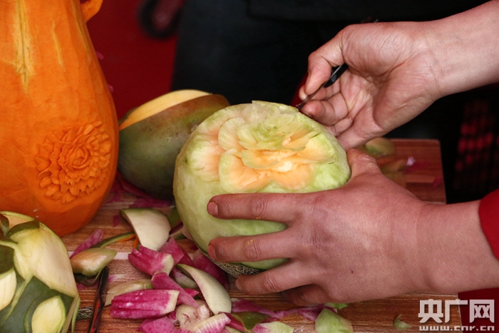新奇特美食展區(qū)的水果雕花攤位讓人大開(kāi)眼界(央廣網(wǎng)見(jiàn)習(xí)記者 韓雪瑩 攝)
