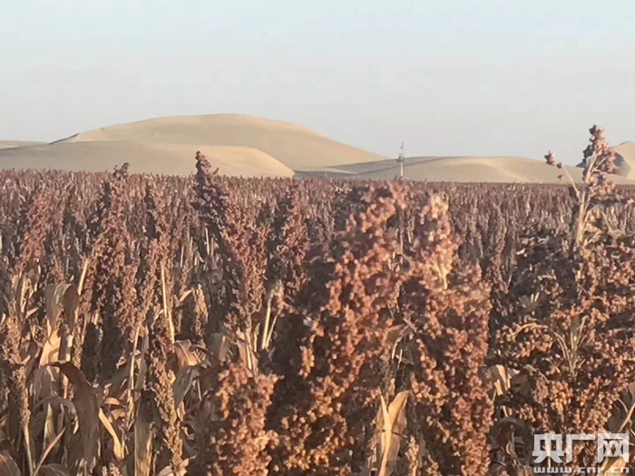沙漠邊笑彎腰的連片紅高粱(央廣網(wǎng)記者 張孝成 攝)