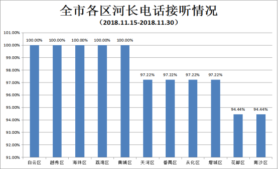 此外,11月19日至12月2日,全市村(居)級河長“四個查清”完成率緩慢上升,為20.43%,大部分河長未能按要求完成內(nèi)容巡河工作,其中越秀區(qū)提升較明顯,完成率達到100%;南沙區(qū)(4.65%)、從化區(qū)(4.80%)、花都區(qū)(8.33%)、黃埔區(qū)(9.52%)、白云區(qū)(10.00%)四個查清完成情況較差。特別是南沙區(qū),沒有明顯改善,而且有下降趨勢。2017年9月9日至2018年12月2日,河長APP問題各區(qū)辦結(jié)率達到89.89%,其中白云區(qū)(83.41%)、番禺區(qū)(84.71%)、海珠區(qū)(84.79%)辦結(jié)情況滯后。11月15日至11月30日,市河長辦抽查了全市區(qū)、鎮(zhèn)(街)、村(居)級河長電話接聽情況共388人次,共有6位村居級河長未接聽電話。其中南沙區(qū)和花都區(qū)接聽率(94.44%),增城區(qū)、從化區(qū)、番禺區(qū)、天河區(qū)接聽率(97.22%),其余各區(qū)接聽率則是(100%)。