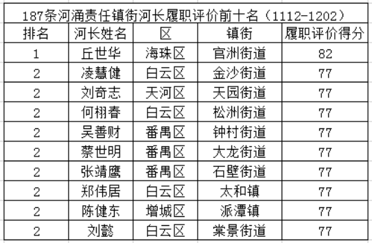 廣州市河長辦每半個多月發(fā)布一期河長管理簡報,對全市河長的履職情況進行統(tǒng)計和評價,以督促各級河長認(rèn)真履職。簡報對187條河涌的鎮(zhèn)街級河長和村居級河長履職情況進行評分,公布分?jǐn)?shù)最高的十名和最低的后十名河長名單。