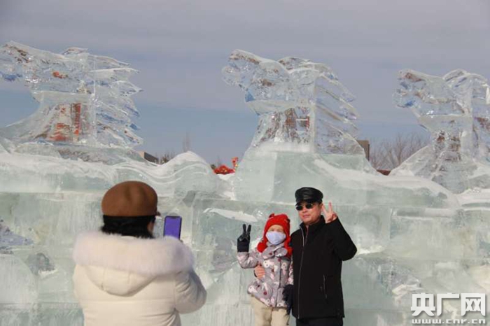 當(dāng)天市民在冰雕前合影(央廣網(wǎng)發(fā) 謝艷紅 攝)