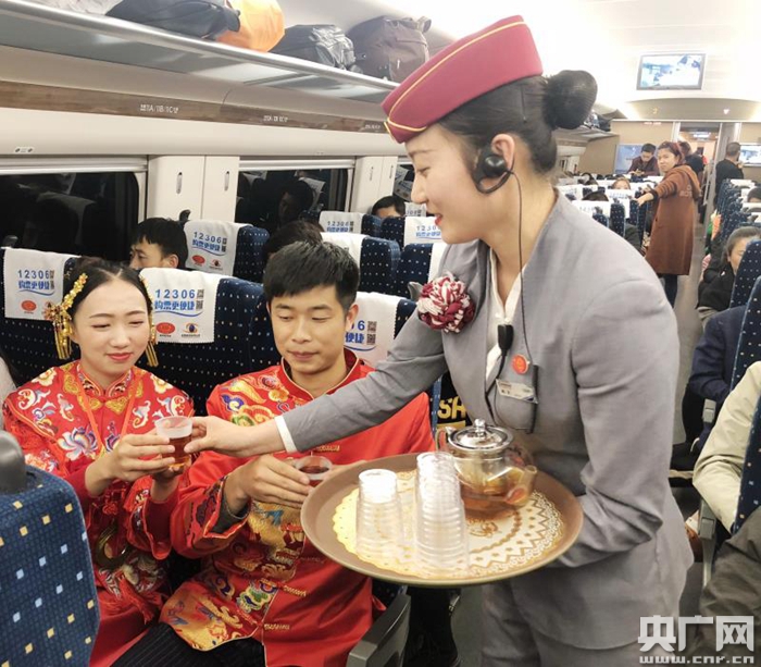此情此景,列車長蔣娜和動姐們忙碌了起來,倒水、沏茶、送祝福,和旅客一起祝福新郎新娘新婚快樂,白頭偕老。行進的動車上,充滿祝福和愛意。