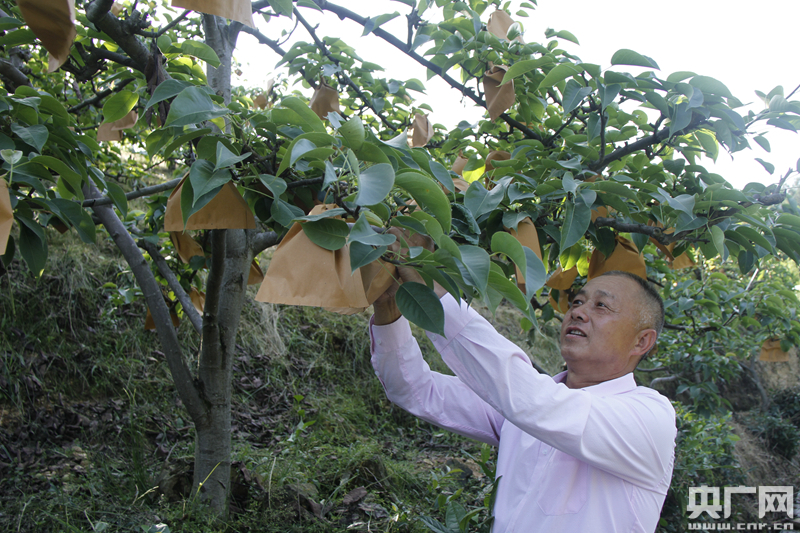 彭飛在果園檢查梨子的生長(zhǎng)情況(張兆福 攝)