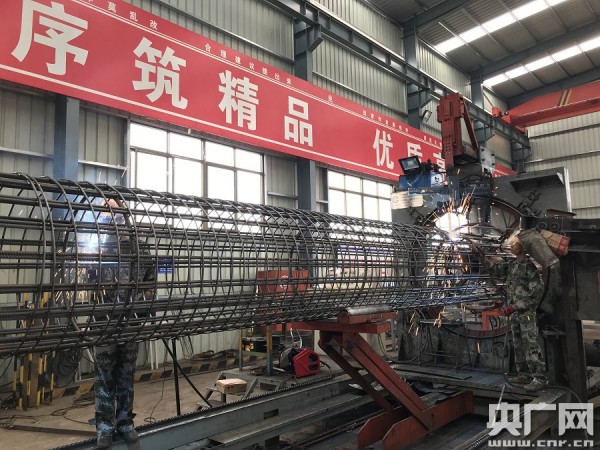 鋼筋加工場工人正在焊接鋼筋籠(央廣網(wǎng)記者 陳庚攝)