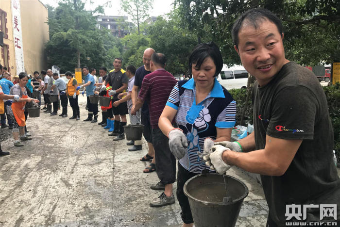在汶川縣水磨鎮(zhèn),干部群眾已投入到了自救清淤工作中。記者在水磨鎮(zhèn)看到,當(dāng)?shù)馗刹咳罕娨约皳岆U(xiǎn)機(jī)械正在加緊開展清淤工作。在水磨鎮(zhèn)游客中心門口,干部群眾一字排開,將房內(nèi)的淤泥裝入水桶不斷向外傳遞出來。