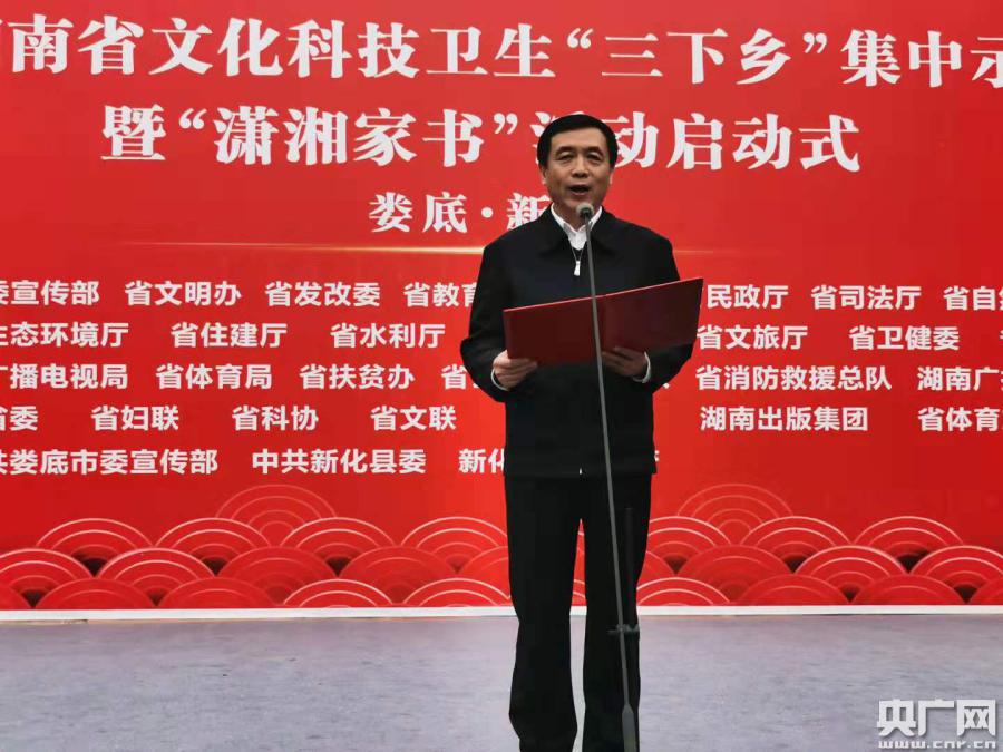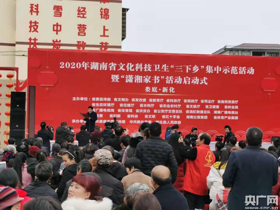 央廣網(wǎng)長沙1月9日消息(記者鄧文輝)1月8日下午,2020年湖南省文化科技衛(wèi)生“三下鄉(xiāng)”集中示范活動(dòng)暨“瀟湘家書”活動(dòng)啟動(dòng)式,在湖南新化縣槎溪鎮(zhèn)朝陽村易地扶貧安置點(diǎn)舉行。