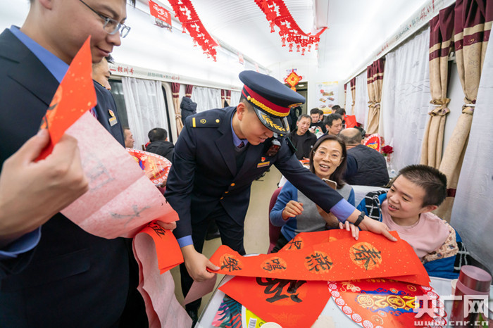 列車工作人員為乘車旅客送春聯(lián)(央廣網(wǎng)發(fā) 通訊員方正 攝)
