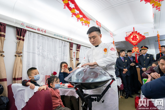 19時20分,列車春晚正式拉開帷幕。列車員馬東一曲悠揚的吉他彈唱《寫給黃淮》,唱出了對家人和故鄉(xiāng)的思念,唱出了對歸家游子的祝福。列車廚師閆乃峰的手碟演奏《煙雨青黛》吸引了眾多旅客的目光,空靈的曲調(diào)、精湛的技藝,引來陣陣贊嘆。