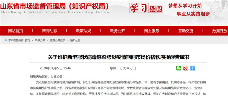 記者了解到,針對(duì)目前的疫情特殊時(shí)期,山東省市場(chǎng)監(jiān)督管理局1月27日發(fā)布《關(guān)于維護(hù)新型冠狀病毒感染肺炎疫情期間市場(chǎng)價(jià)格秩序提醒告誡書》,要求各相關(guān)經(jīng)營(yíng)者及行業(yè)協(xié)會(huì)要認(rèn)真對(duì)照提醒告誡要求,積極開展自查整改,規(guī)范自身價(jià)格行為。對(duì)經(jīng)提醒告誡后仍不整改的違法行為,市場(chǎng)監(jiān)管部門將依法予以處罰并通過新聞媒體公開曝光。(圖片均來自網(wǎng)絡(luò)或網(wǎng)友提供)