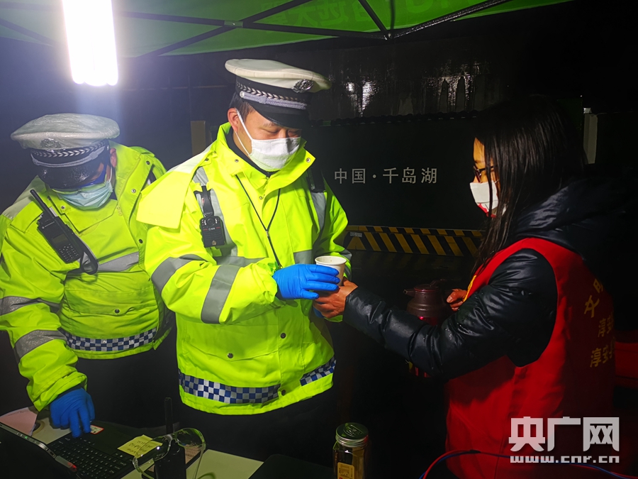 志愿者給執(zhí)勤警察送去姜湯后(央廣網(wǎng)發(fā) 淳安宣傳部供圖)