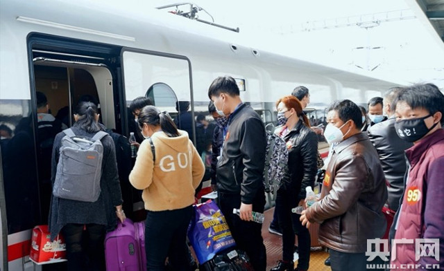 務(wù)工人員乘復(fù)工專列往前珠三角地區(qū)(央廣網(wǎng)發(fā) 通訊員供圖)
