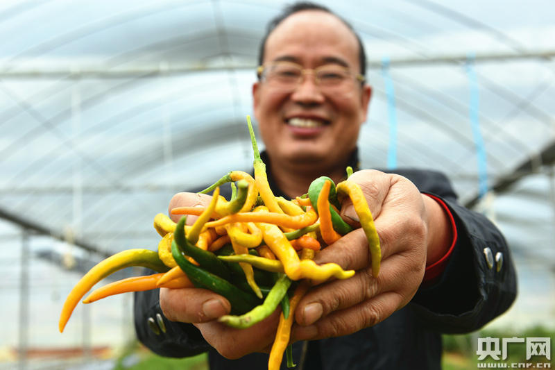 湖南衡東吳集鎮(zhèn)紅坪村楓仙嶺蔬菜基地負(fù)責(zé)人展示剛剛采摘的黃貢椒(央廣網(wǎng)發(fā) 肖亞輝攝)