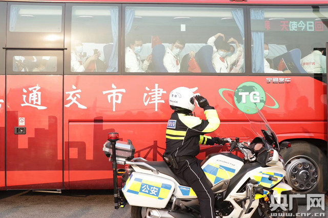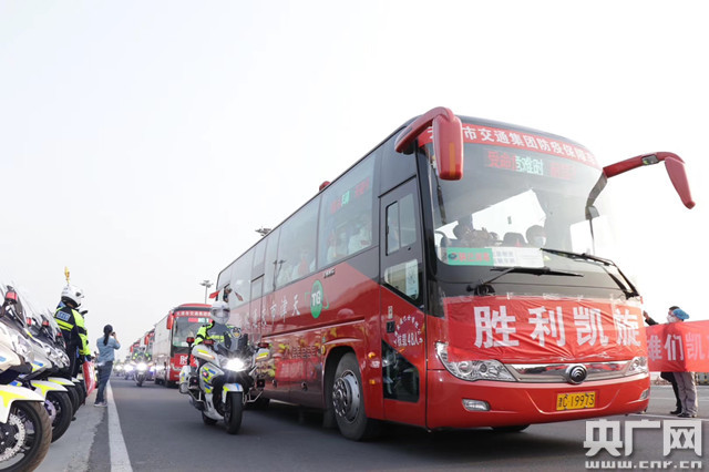 醫(yī)療隊(duì)成員集體乘車返回(央廣網(wǎng)記者 褚夫晴 攝)