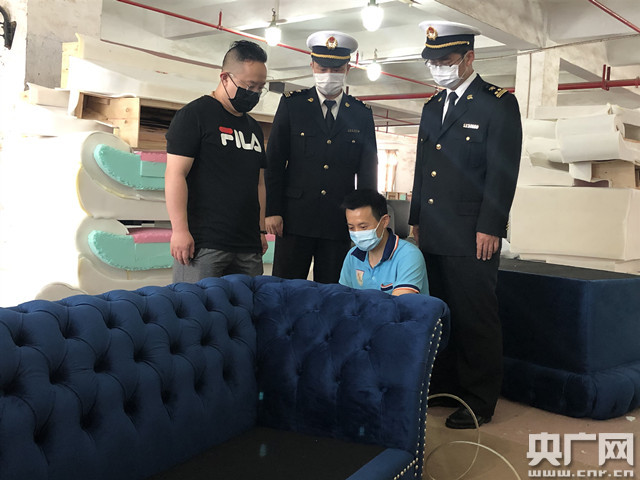 廣州海關(guān)所屬荔灣海關(guān)關(guān)員在疫情期間對市場采購試點參與經(jīng)營家具出口商戶開展巡查(央廣網(wǎng)發(fā) 海關(guān)供圖)