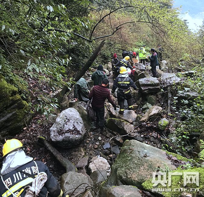 勘察現(xiàn)場地形后,救援人員迅速利用安全繩搭建救援通道,相繼將游客轉(zhuǎn)移到安全地帶。經(jīng)過暫短的休整后,救援人員護送著兩名獲救游客,在向?qū)У膸ьI(lǐng)下向著山下瓦屋山鎮(zhèn)轉(zhuǎn)移。