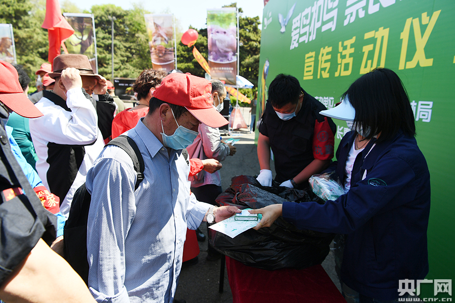 野生動(dòng)物保護(hù)工作者向市民發(fā)放宣傳品(潘曉威 攝)