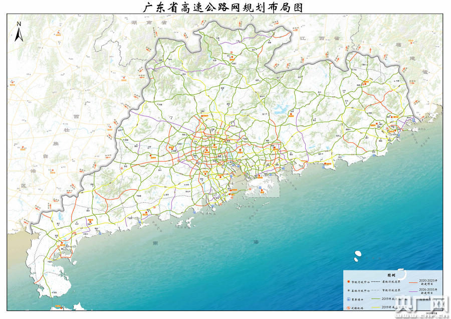 第三階段,到2035年底,全省高速公路通車里程約15000公里。其中,珠江三角洲地區(qū)約7100公里,粵東西北地區(qū)約7900公里,全面完成廣東省高速公路建設。部分遠景展望線開展前期研究或啟動實施。廣東與相鄰省區(qū)間34條高速公路出省通道全部打通,其中,通福建6 條,通江西7 條,通湖南7 條,通廣西13 條,通海南1 條。