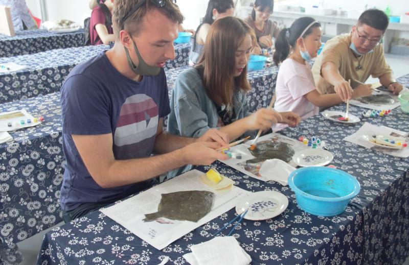 在象山縣“非遺百工坊”,20余名留學(xué)生和漢語(yǔ)國(guó)際教育碩士生在寧波市級(jí)非遺傳承人盧圣貴的現(xiàn)場(chǎng)指導(dǎo)下,學(xué)習(xí)并體驗(yàn)制作了魚(yú)拓作品。當(dāng)看到一條普通的海魚(yú)通過(guò)定型、上色、拓印幾道工序,最終成為一件件形態(tài)各異、色彩繽紛的魚(yú)拓作品時(shí),師生們深感民間藝術(shù)在簡(jiǎn)單質(zhì)樸的藝術(shù)手法之下所蘊(yùn)藏的豐富藝術(shù)內(nèi)涵與魅力。