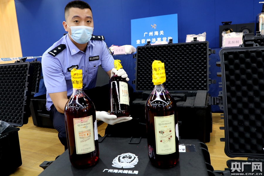 廣州海關(guān)緝私警察在廣州海關(guān)打擊毒品走私新聞發(fā)布會上展示此前所查獲的藏匿于“紅酒”中的液態(tài)可卡因(央廣網(wǎng)發(fā) 池兆恩 攝)