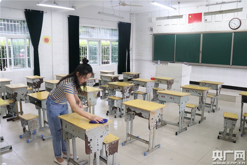 工作人員正在考場內用消毒水擦拭桌面。(央廣網記者徐鵬 趙家慧 攝)