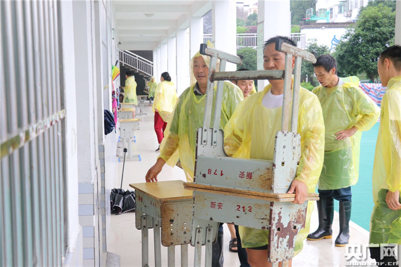 工作人員將桌椅有序搬進考場。(央廣網記者徐鵬 攝)