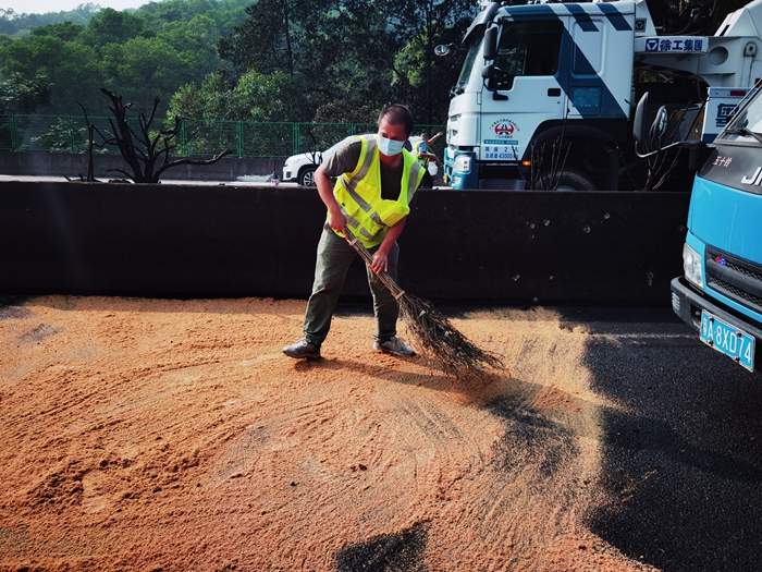 截至5日下午4點(diǎn),廣韶高速養(yǎng)護(hù)人員共使用木屑50袋,共計(jì)1000公斤,對近4000平方米的油污路面進(jìn)行清理,現(xiàn)已清理完畢。