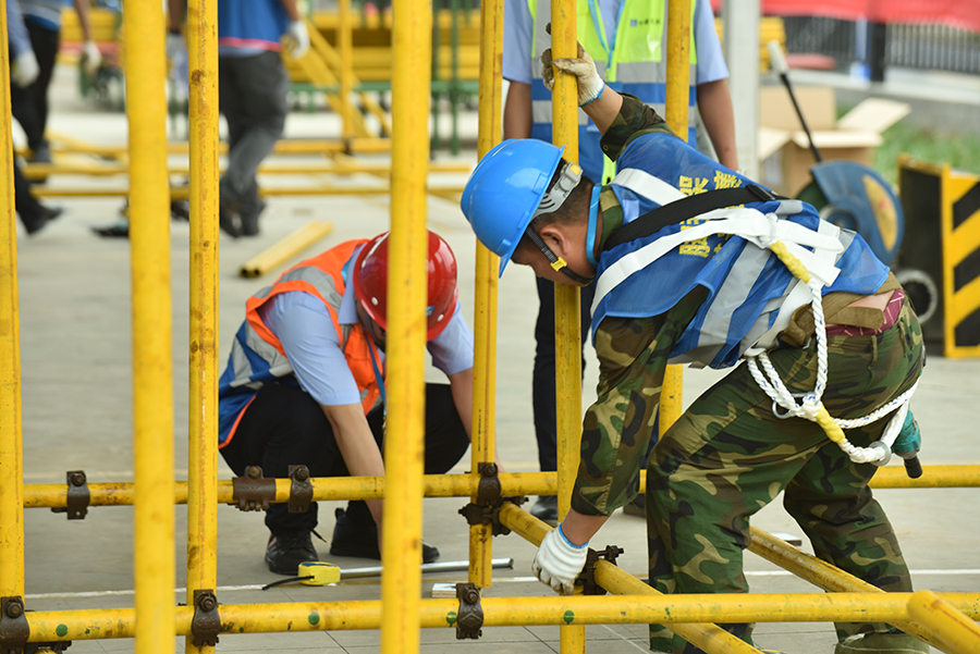 上午9:00,本屆比賽正式開始,鋁合金模板、腳手架搭設(shè)、電焊三個項目的參賽隊員迅速投入到緊張的比賽中,他們認(rèn)真拼裝、搭設(shè)、起焊,一場全面展現(xiàn)現(xiàn)代建筑工人風(fēng)采的技能較量正式開始。在前一天下午,參賽人員參加了鋁合金模板、腳手架搭設(shè)、電焊和安全隱患排查等項目的理論考試。