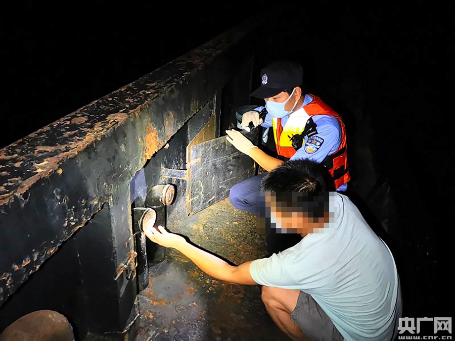 廣州海關(guān)緝私警察檢查涉案船只船員指認(rèn)的改裝油口(央廣網(wǎng)發(fā) 海關(guān)供圖)