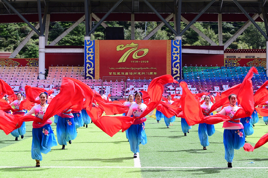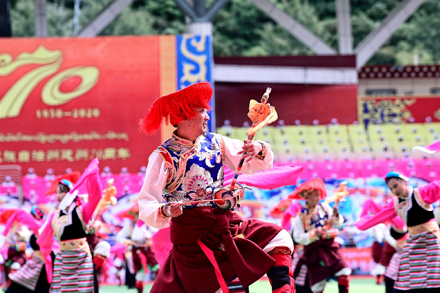 四川甘孜藏族自治州成立70周年慶祝大會群眾文藝演出(央廣網(wǎng)發(fā) 甘孜州委宣傳部供圖)