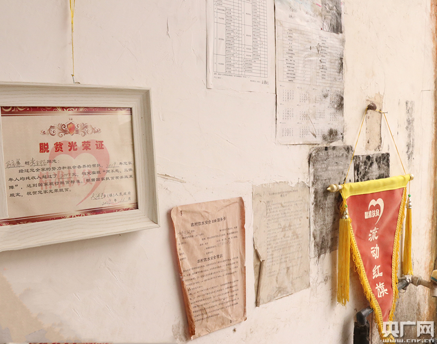 懸掛在李喜柱家墻壁上的脫貧光榮證和精準扶貧流動紅旗(央廣網(wǎng)記者 汪寧 攝)
