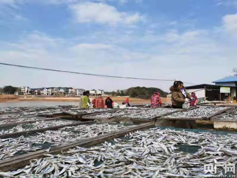 九江都昌縣薌溪鄉(xiāng)井頭村村民在翻曬小魚干(央廣網(wǎng)發(fā) 通訊員供圖)