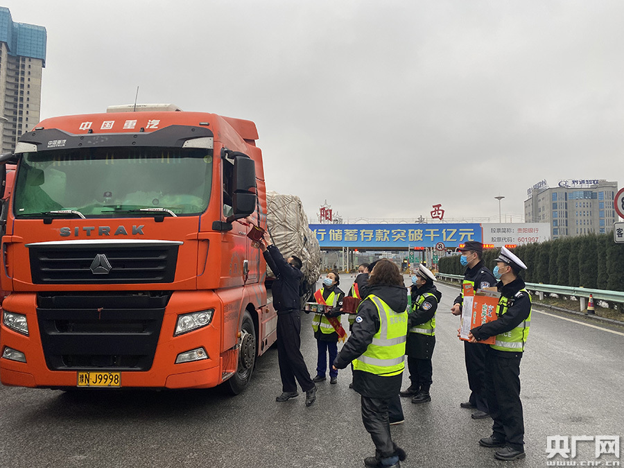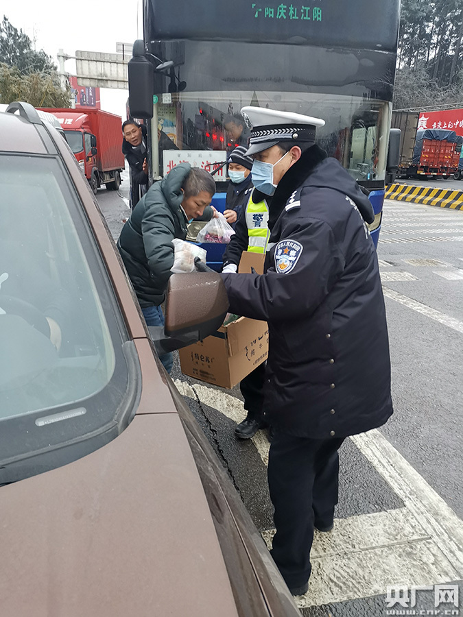 高速交警給滯留貨車司機(jī)送去暖心食品(央廣網(wǎng)發(fā) 貴陽市交通管理局供圖)