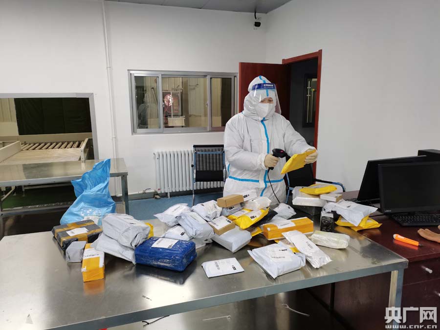 阿拉山口海關(guān)在對跨境電商出口包裹實施查驗前掃碼作業(yè)(央廣網(wǎng)發(fā) 通訊員陳乾 攝)