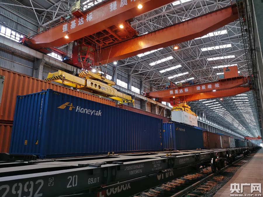 中歐班列搭載跨境電商包裹駛出口岸(央廣網(wǎng)發(fā) 通訊員陳乾 攝)