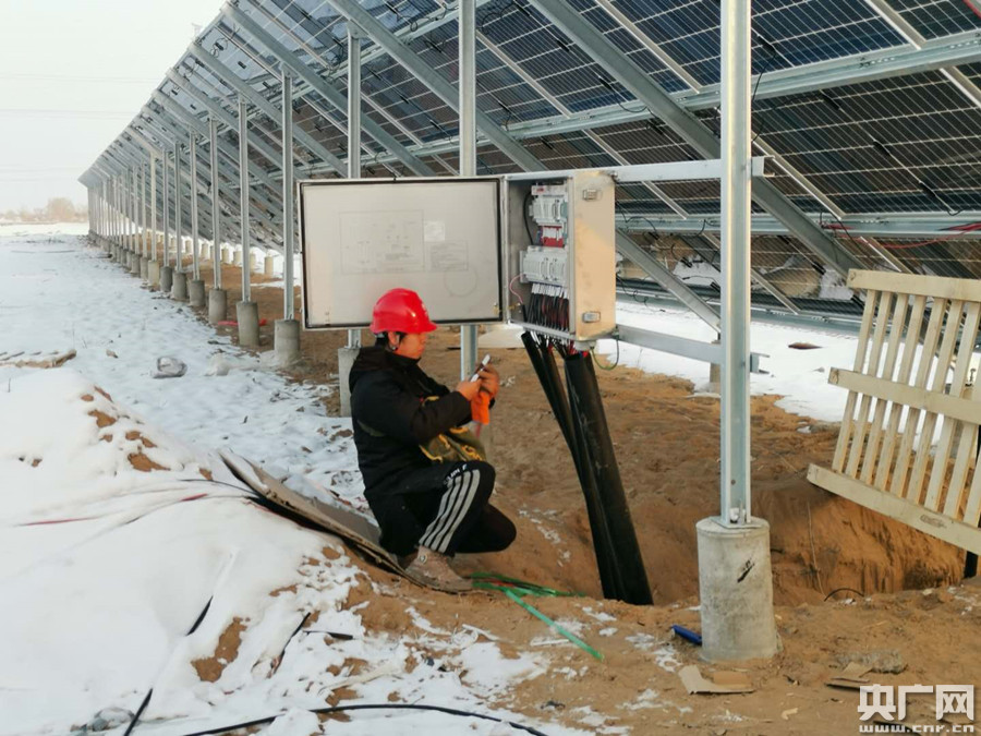 電力員工張曉磊冒著嚴(yán)寒檢查光伏發(fā)電板運(yùn)行狀況(央廣網(wǎng)記者 張孝成 攝)