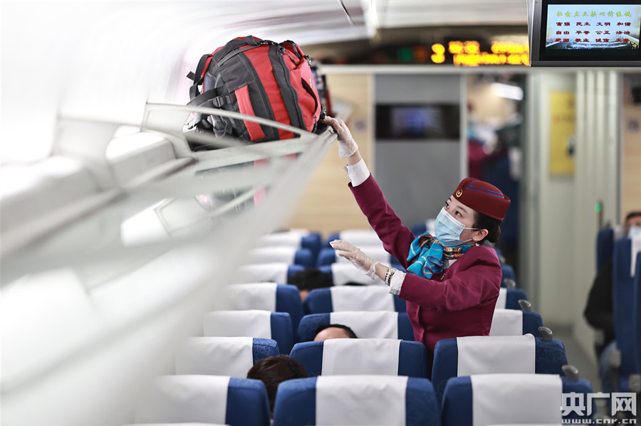 當(dāng)列車啟動,胡程程和同事們開始了車廂巡查,每20分鐘走動一次,主要檢查行李有沒有超出行李架,有沒有乘客把重物放在小桌板上,車廂是否整潔等等。
