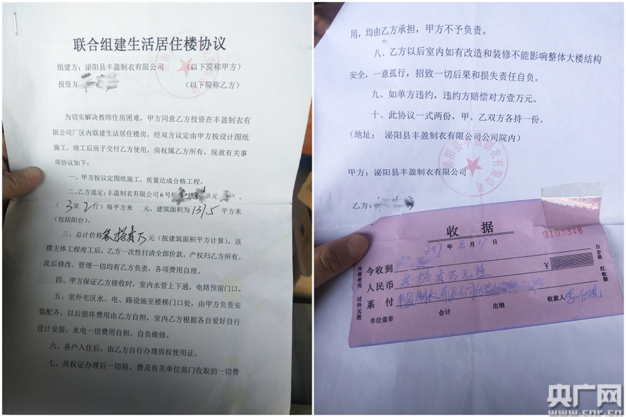 同時,記者從業(yè)主提供的房屋交易手續(xù)中發(fā)現(xiàn),業(yè)主提供的交易憑證是兩個版本:業(yè)主直接從豐盈制衣簽的協(xié)議為“聯(lián)合組建生活居住樓協(xié)議”,協(xié)議上有“組建房:泌陽縣豐盈制衣有限公司”字樣,購買后再次轉賣協(xié)議為“房屋買賣合同”,甲方(出賣人)為賣房者名字,乙方(買受人)為購買者名字,也同時有手寫收款收據(jù)。
