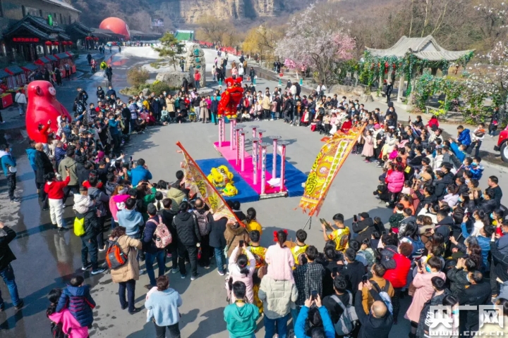 春節(jié)期間,游人在河南云臺(tái)山景區(qū)觀看民俗舞獅表演。(央廣網(wǎng)發(fā) 吳沛萌 攝)