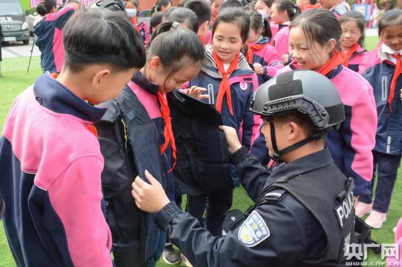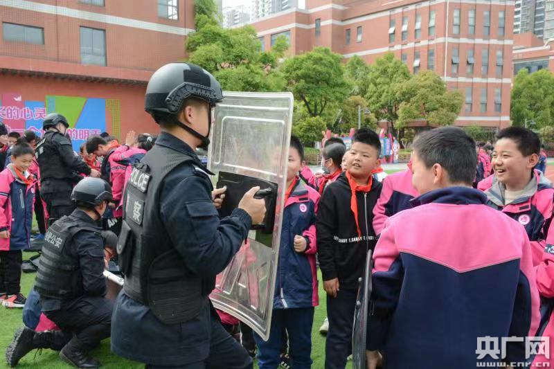 與此同時,學校操場上,三年級的小朋友正圍著合肥市公安局特巡警支隊黑豹突擊隊民警,爭先恐后體驗警用盾牌、作戰(zhàn)背心等警用裝備,學習自我保護的一些小知識。