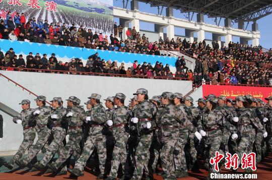 12月30日,新疆伊寧縣三千余“90后”農(nóng)民在結(jié)束為期近一個(gè)月的軍事訓(xùn)練和公共課的冬季培訓(xùn)后,在該縣體育場(chǎng)舉行了軍訓(xùn)會(huì)操表演,以展示他們的青春豪氣和培訓(xùn)成果。朱景朝 攝