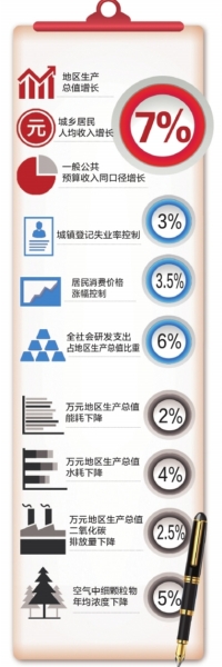 2015年,全市經(jīng)濟(jì)社會(huì)發(fā)展主要預(yù)期目標(biāo)是,地區(qū)生產(chǎn)總值增長7%左右;城鎮(zhèn)登記失業(yè)率控制在3%以內(nèi);城鄉(xiāng)居民人均收入實(shí)際增長7%;居民消費(fèi)價(jià)格漲幅控制在3.5%左右;一般公共預(yù)算收入同口徑增長7%以上;全社會(huì)研發(fā)支出占地區(qū)生產(chǎn)總值比重6%左右;萬元地區(qū)生產(chǎn)總值能耗、水耗和二氧化碳排放量分別下降2%、4%和2.5%,空氣中細(xì)顆粒物年均濃度下降5%左右。