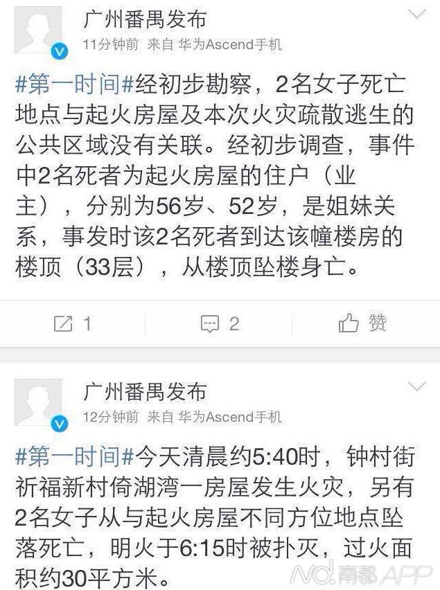 據(jù)今早廣州番禺發(fā)布微博,住戶兩姐妹一名56歲,一名52歲,墜樓處與本次火災(zāi)疏散逃生公共區(qū)域無關(guān)。