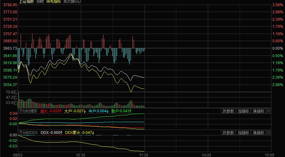 央廣網(wǎng)北京8月3日消息 周一,兩市低開(kāi)后滬指圍繞3600點(diǎn)震蕩,至午盤(pán)滬指下跌2.43%,報(bào)3574.80點(diǎn)。