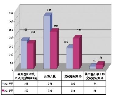 1.同比查處問題和處理人數(shù)略有減低,但黨政紀(jì)處分力度加大。今年上半年,全區(qū)共查處違反中央八項(xiàng)規(guī)定精神問題153起,處理223人,其中黨紀(jì)政紀(jì)處分183人。與去年上半年同口徑統(tǒng)計(jì)項(xiàng)目相比查處問題數(shù)減少8.9%,處理人數(shù)同比減少29.9%,但黨紀(jì)政紀(jì)處分人數(shù)同比卻增加46.4%,特別是黨紀(jì)政紀(jì)處分中處理縣處級干部同比增加64.3%。這說明,今年全區(qū)各級紀(jì)檢監(jiān)察機(jī)關(guān)嚴(yán)字當(dāng)頭,加大了執(zhí)紀(jì)問責(zé)力度,動(dòng)輒則咎,從嚴(yán)從重懲處,切實(shí)提高監(jiān)督執(zhí)紀(jì)的實(shí)效性、震懾力,使紀(jì)律立起來、嚴(yán)起來。