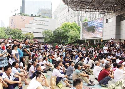 ▲ 上海南京路步行街世紀廣場上擠滿了觀看閱兵式實況轉(zhuǎn)播的人群。 經(jīng)濟日報記者 李治國攝