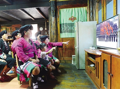 ▲ 廣西龍勝的瑤族群眾觀看閱兵直播。 韋吉陽攝(新華社發(fā))