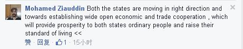 網(wǎng)友Mohamed Ziauddin:兩個(gè)國(guó)家都走在正確的方向上,將開展全面的經(jīng)濟(jì)與貿(mào)易合作,這將為雙方國(guó)家的人民帶來(lái)福祉,并提高他們的生活水平。
