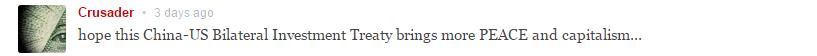 網(wǎng)友Crusader:如果中美雙邊投資協(xié)定(BIT)能夠簽署,將為世界帶來(lái)和平與資本的繁榮。